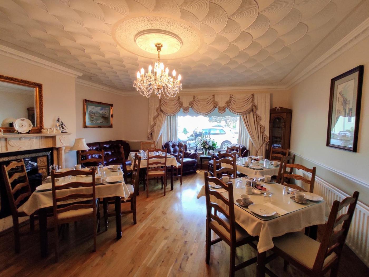 The traditional dining room has bespoke wooden furniture and an open fireplace. Breakfasts use fresh local produce and include homemade breads and cakes.